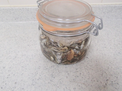 清潔な保存容器にかえり、くるみを入れて、万能らっきょう酢を注ぐ。