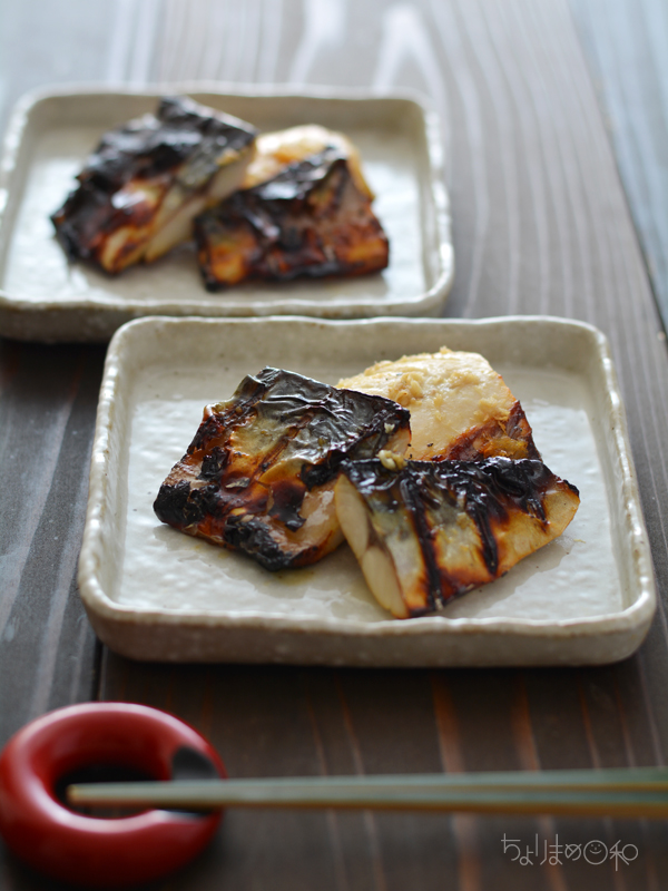 塩サバにしょうがのすりおろしとみりんをかけて漬けてから、グリルで焼くだけ。