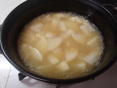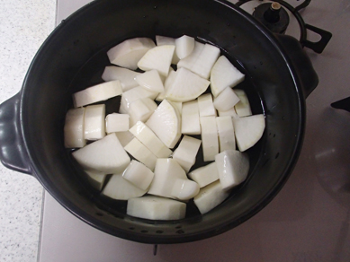 1.鍋にだし昆布、水、酒を注ぎ、大根、餅を順で入れる。