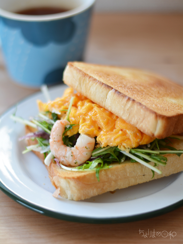 水菜とエビのサラダが残ったので、翌朝はサンドに。