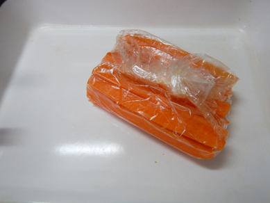 海水程度(3%)の塩水で洗い、しっかりとペーパーで水気をとる。1.2cm角くらいに長細く切る。