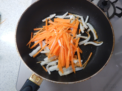 1.フライパンに油を入れて強火で熱し、ちくわ、にんじんを入れて炒める。