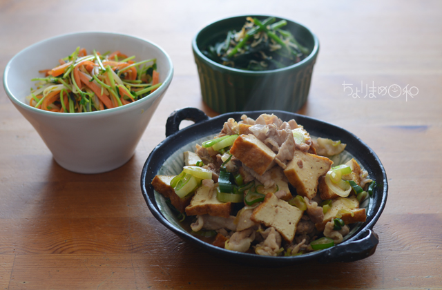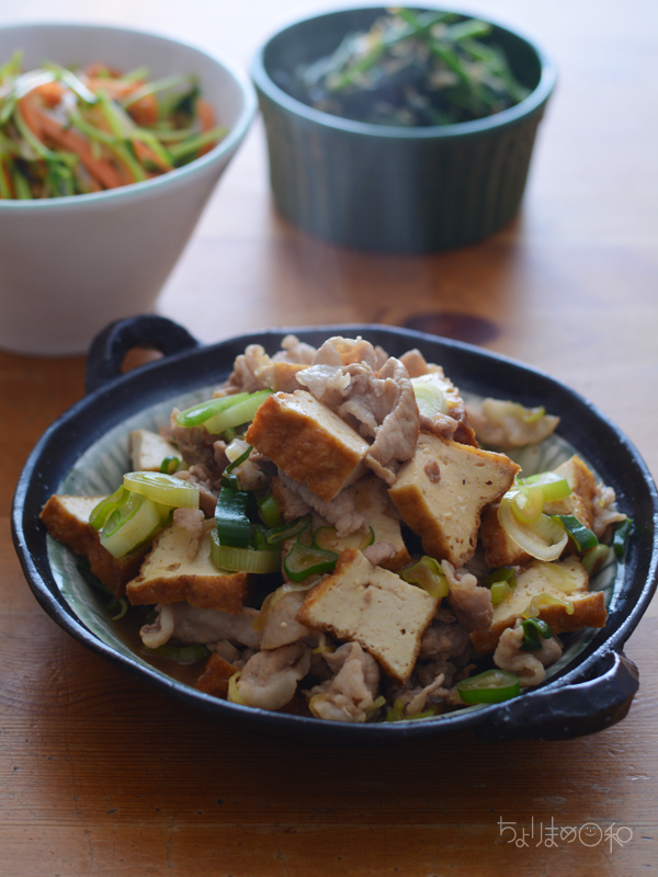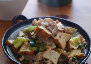豚肉の切り落とし、厚揚げ、長ねぎ。