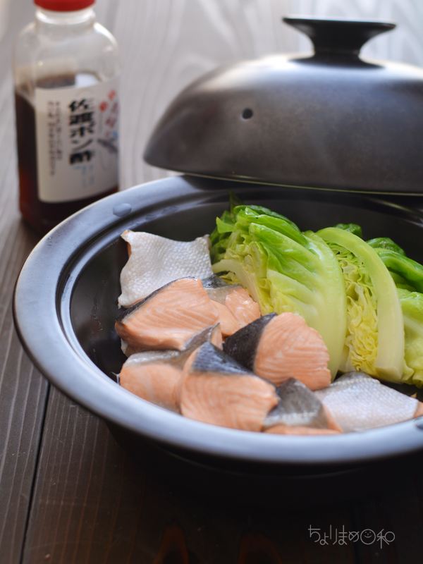 塩水で洗った生鮭をキャベツを一緒に蒸すだけ。