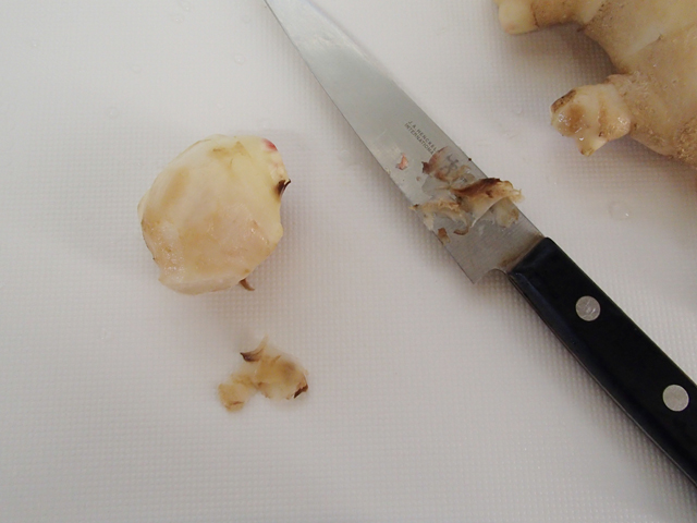1.新生姜はまわりの茶色の部分を包丁で軽く落とし、両端を少し落とす。