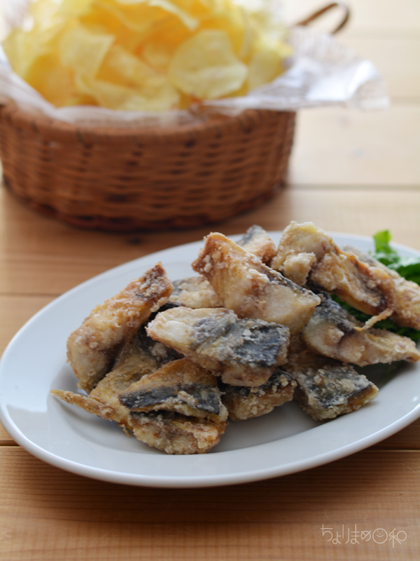 ポテトチップスを揚げるついでに、塩サバも揚げてしまおうって。