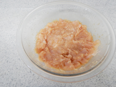 1.耐熱ボウルに鶏ひき肉、Aを合わせて混ぜる。