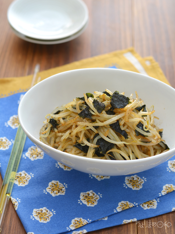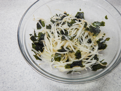 2.もやしが人肌に冷めたら、のり、オリーブ油、にんにく醤油を順で加えて和える。