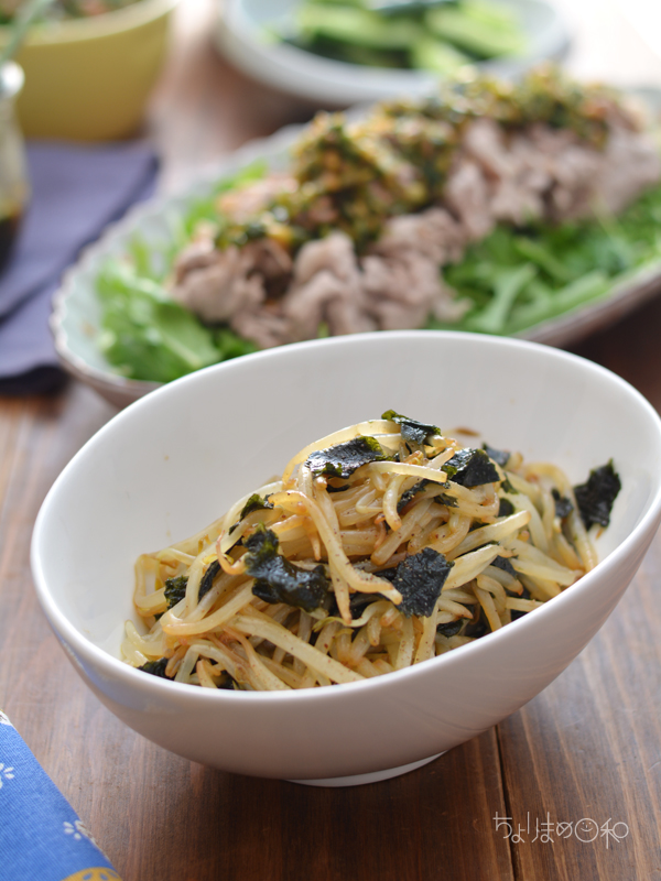 1.耐熱ボウルにもやしを入れてラップをし、電子レンジで4分加熱する。盆ざるに広げて冷ます。