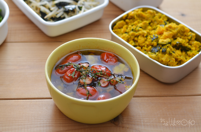 タコとミニトマトをレンジでマリネ。