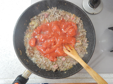 3.トマト缶を入れてトマトをつぶすように炒める。
