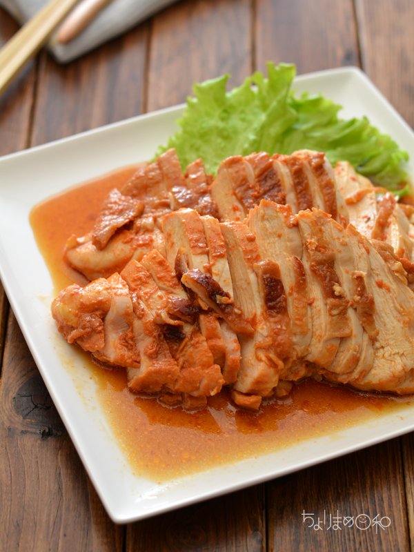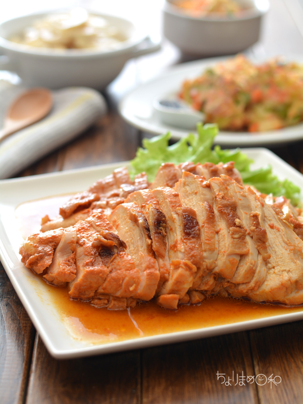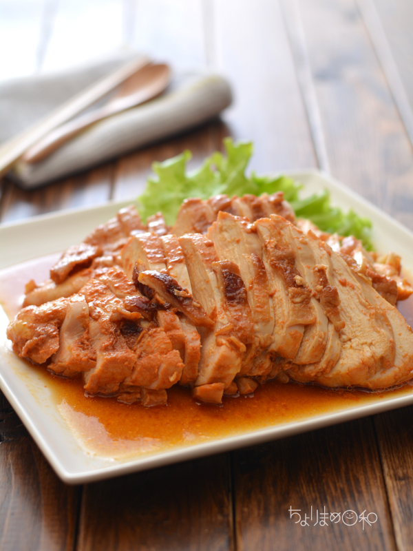 3.電子レンジ(600W)で8分加熱し、裏返して2分加熱する。粗熱がとれるまで冷まして切り分け、汁を鶏肉にかける。