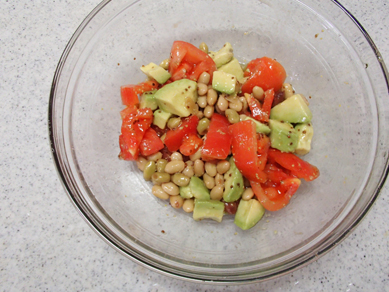 1.ミックスビーンズ、トマト、アボカド、Aを入れて混ぜ和える。