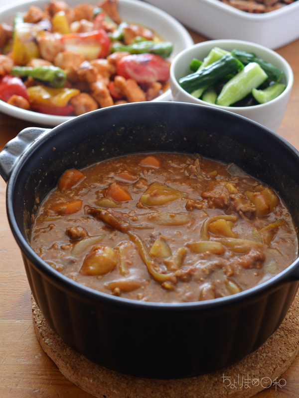 翌日のことも考えて、作り置きカレーを。