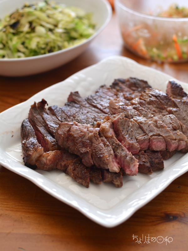 焼くだけの簡単ステーキ。もんちゃんの大好物です。