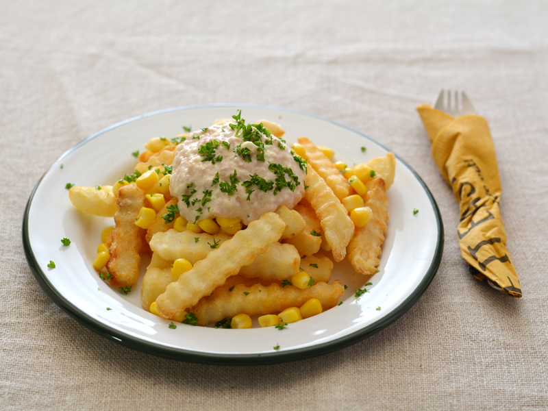 波型のフライドポテト「ゴールデンクリンクル」に人気&お手軽食材のツナをON!ボリュームたっぷりのローディット・フライです。ツナはヨーグルトベースで作るサワークリームオニオン風味でさっぱりと。冷凍野菜感覚で使えるゴールデンクリンクルで手軽におつまみにもよし、おやつにもよしの箸が止まらない味わいです☆コーンを加えてさらにお子様に喜ばれる要素をON!