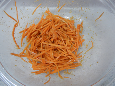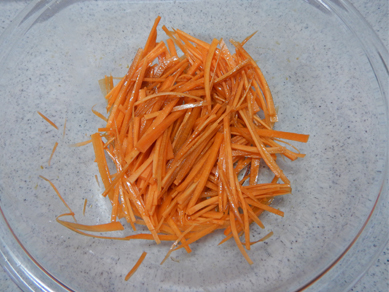 1.耐熱ボウルににんじん、しょうゆ、油、酢を合わせて和える。