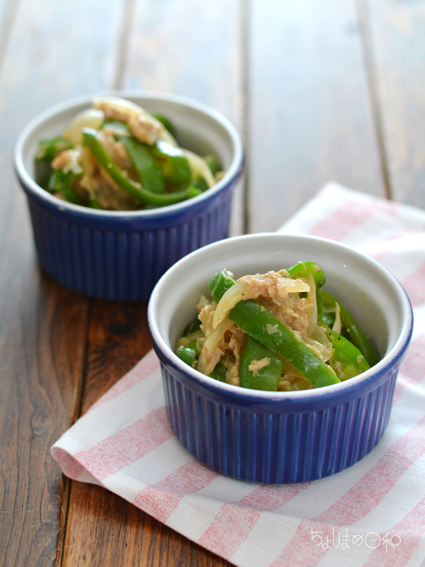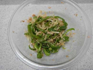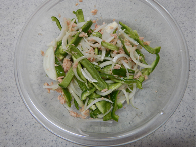 1.耐熱ボウルにピーマン、玉ねぎ、ツナ(オイルごと)を入れて和える。