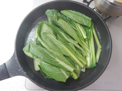 1.フライパンに湯をはり、塩を入れる。小松菜を入れて1分ほど塩ゆでする。ざるに広げて冷ます。冷めたら長さ2.5cm程度に切る。