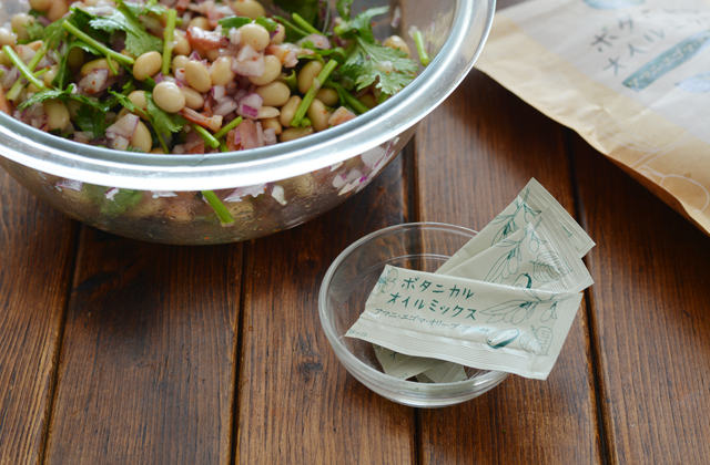 3.ナンプラー、レモン汁、レッドペパーを入れて和え、ボタニカルオイルミックスを入れて和える。