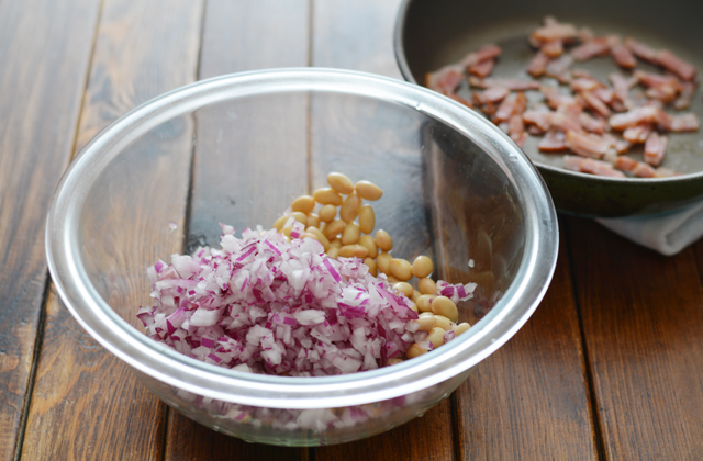 ボウルに大豆水煮、アーリーレッドを入れて、