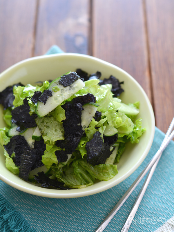 冷蔵庫のレタス、きゅうりなどの野菜を焼きのりで、