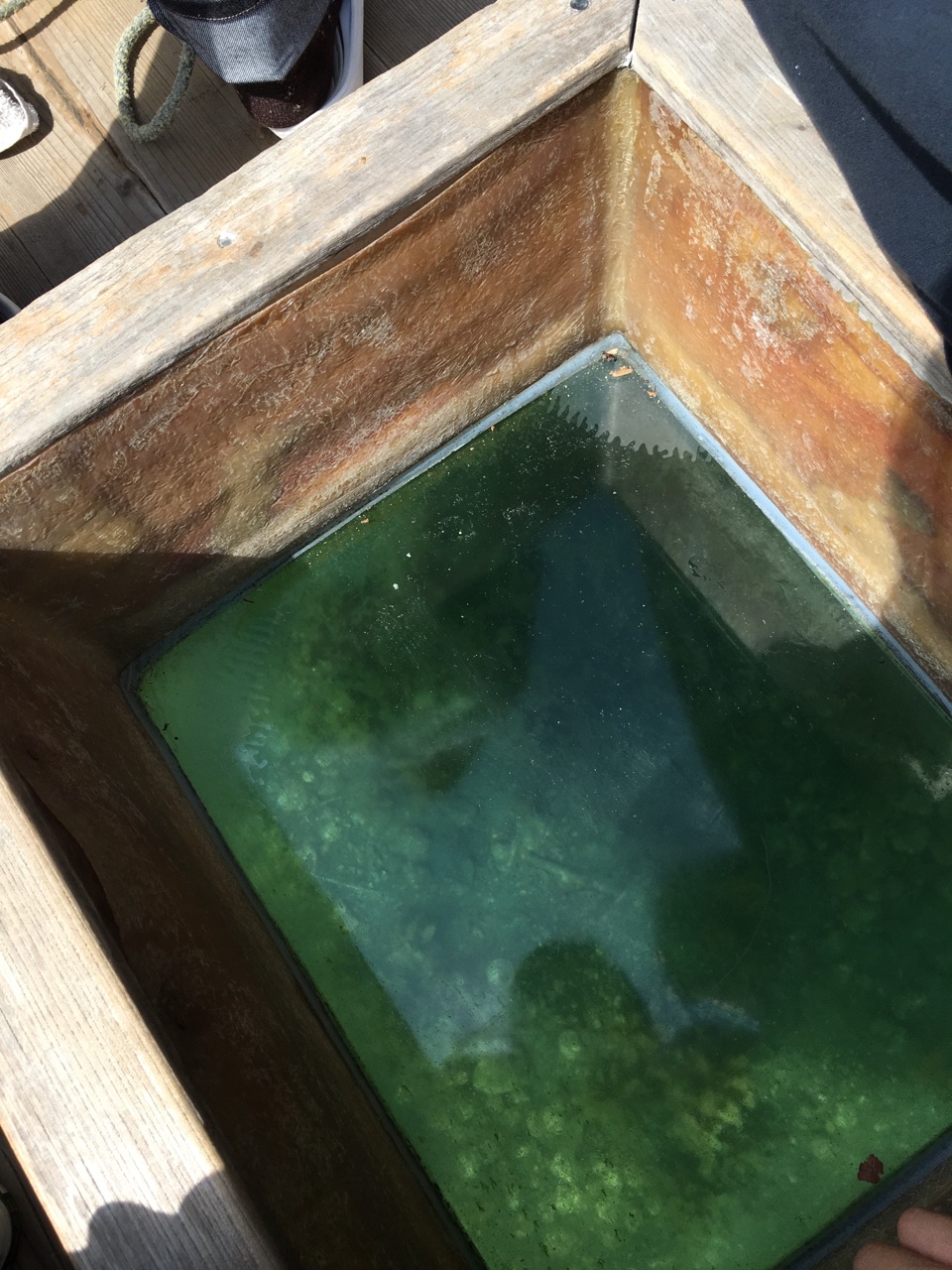 舟の中からも海底の様子が見れる窓がついてます。時に魚が通ります。^^