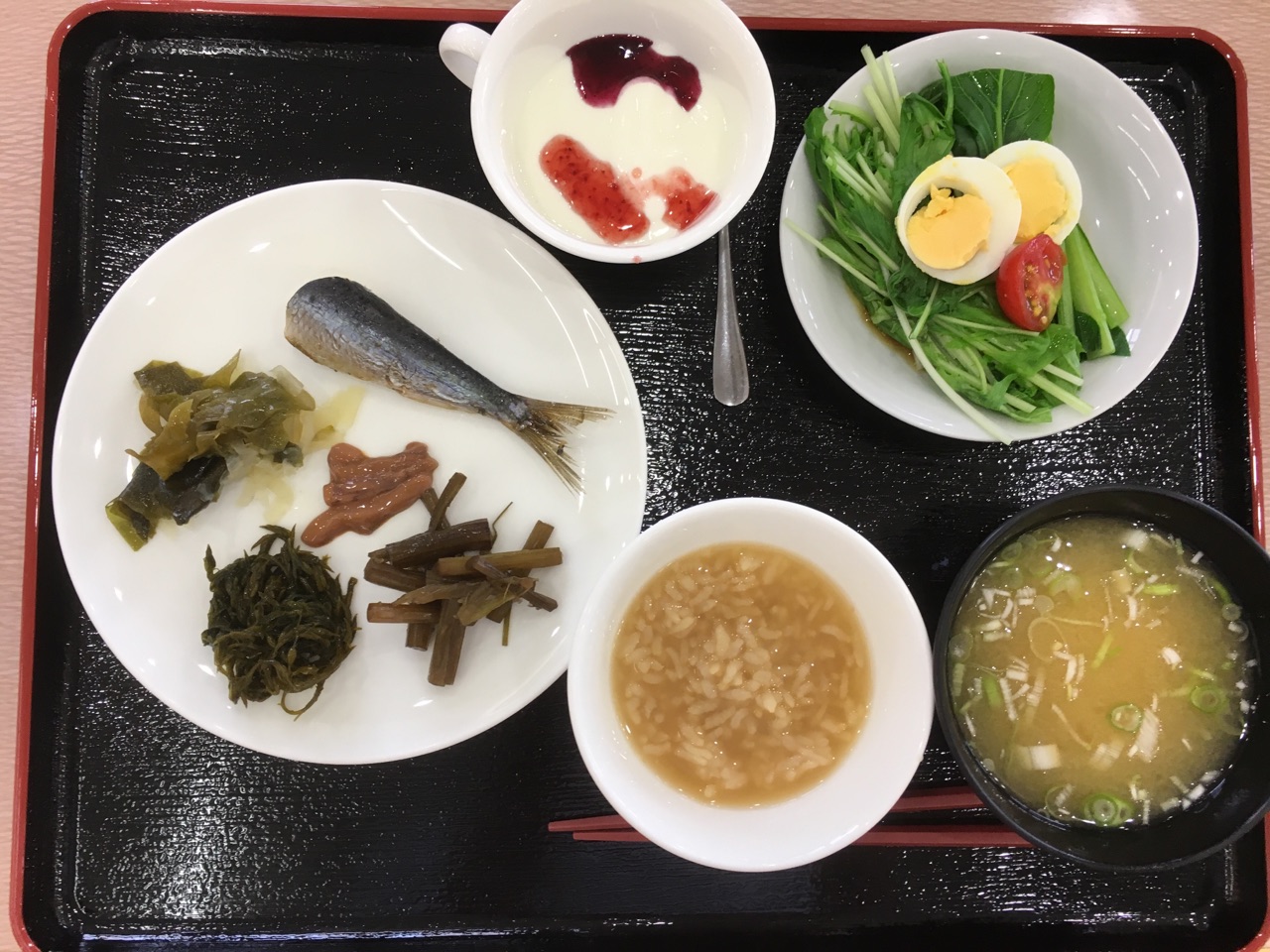 今井茂助商店さんの一夜干しのいかの塩辛、きゃらぶき、ぎんば草の味噌漬け、小木・達者の郷土料理のにえ、佐渡乳業のヨーグルト。
