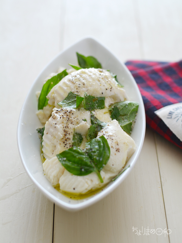 寄せ豆腐にバジル、オリーブ油、ゲランドの塩、粗びき黒こしょう。