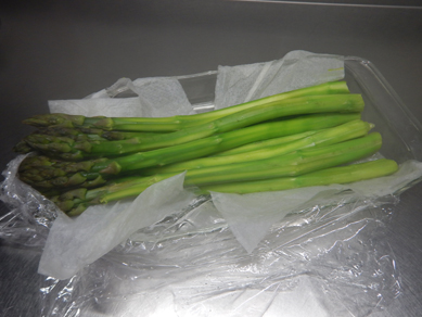1.アスパラガスをキッチンペーパーで包み、水にくぐらせて耐熱皿にのせる。