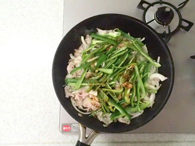 2.豚肉に火が通ったらピーマンを入れてさらに炒め、塩をふる。