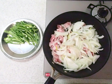 1.フライパンに油を入れて強火で熱し、豚肉を入れてひと炒めし、玉ねぎをのせて炒める。