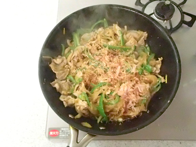 3.Aを加えて汁気を飛ばすように炒め、火を止めてから削り節をちらして全体を混ぜる。