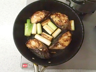 3.軽く汁気をきった【1】を入れ、ブリの両面に焼き色をつける。