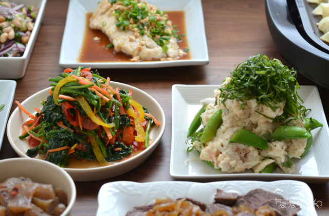 奥は、先日うちラボしたときのミャンマー料理のお豆のサラダ(ペーピョットッ)。