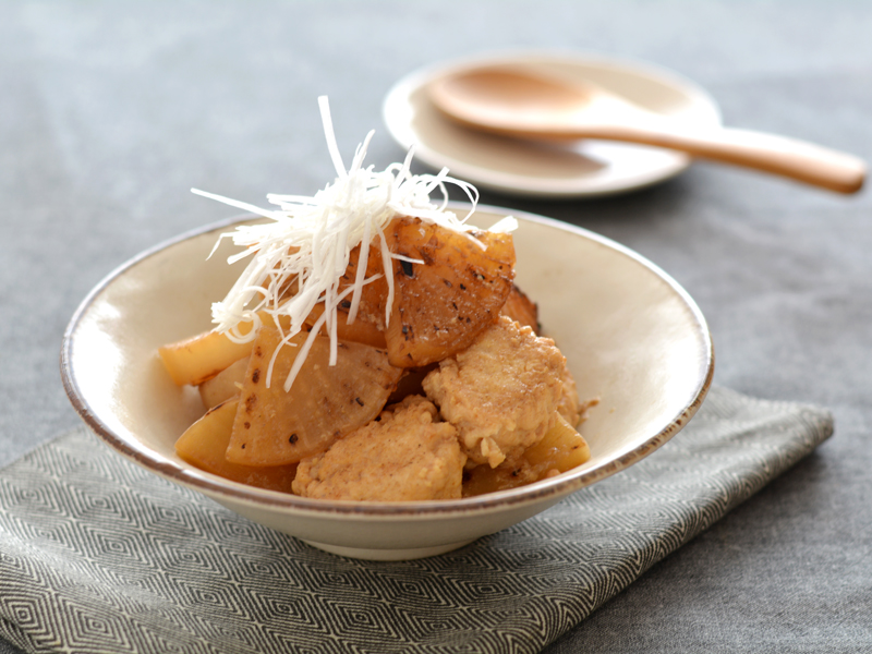 鶏つくねとしみしみ香ばし焼き大根の煮物です。