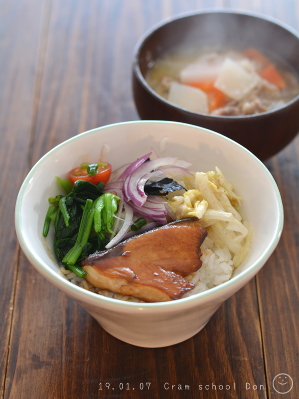 こんな風に、塾前ごはんの塾前丼は、おかずを全部のっけで。