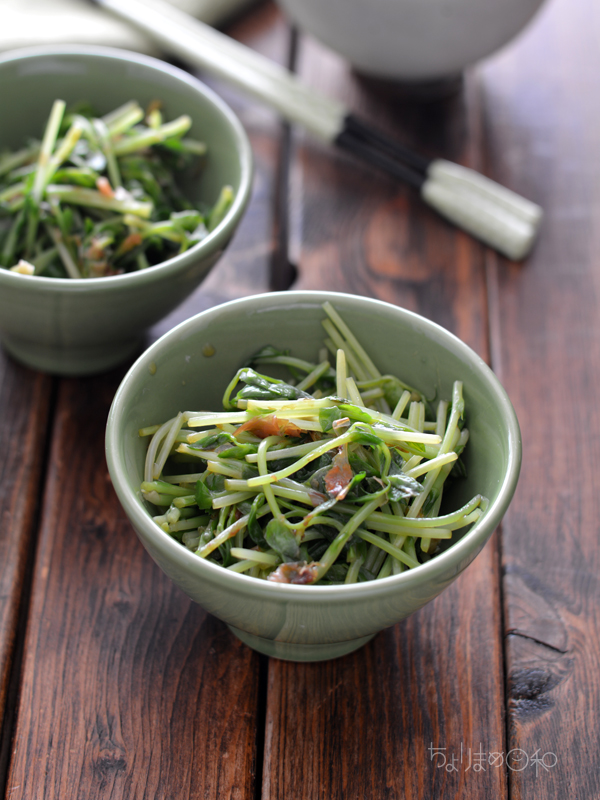 豆苗はレンジで加熱して、ラー油と削り節、しょうゆで調味。