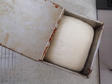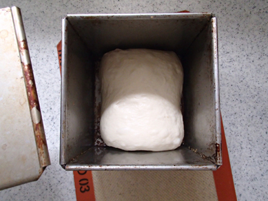4.40℃で約35分、2次発酵する。角食のふたをする。