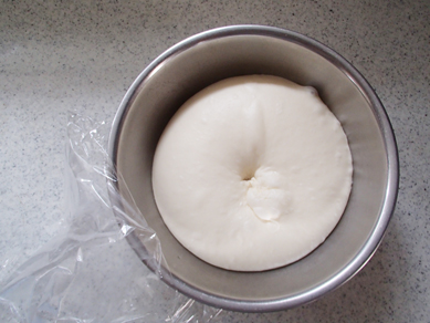 2.40℃で約40分、1次発酵する。生地が2倍の大きさになったら、*フィンガーテストをする。(人差し指を生地に指し込んで指の跡が残っている状態)