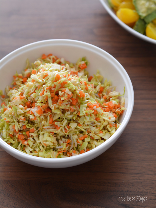 キャベツとにんじんをみじん切りして、塩をふったらしばらくおいて塩もみ。