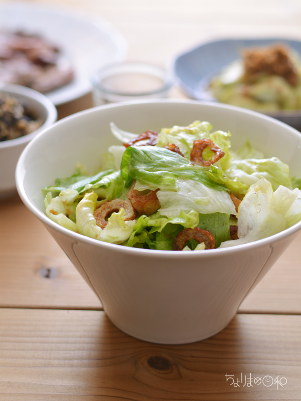 レタスたっぷり1玉使って、焼いたちくわとのサラダ。