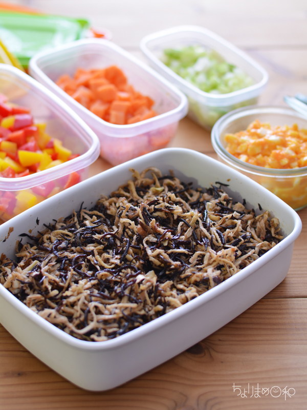 【梅おかか切り干しひじき】と朝ごはん用の【ノンマヨたまごサラダ】も。