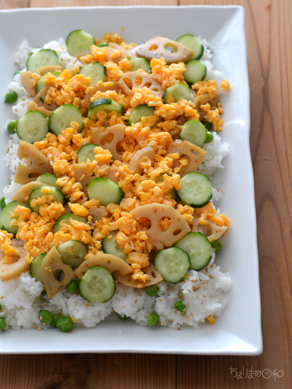 グリーンピースは酢飯と合わせて白ごまをふって、卵、れんこん、きゅうりをトッピング。