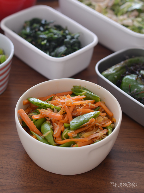 油でにんじんとしらすを炒め、塩ゆでしたスナップエンドウを入れてさっと炒める。