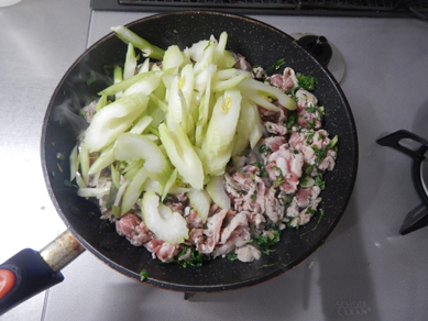 2.豚肉に火が通りはじめたらセロリの茎を入れて炒める。