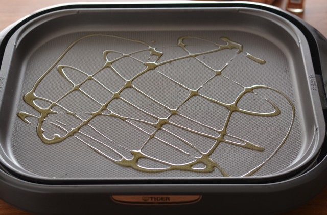 2.ホットプレートにオリーブ油適量(分量外)を入れ、250℃にセットする。