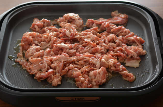 ポリ袋で下味をつけた豚肉を温めたプレートでじゅうじゅう焼きます。