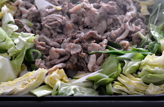 5.野菜に火がとおったら豚肉を一緒にいただく。お好みで一味唐辛子をふる。