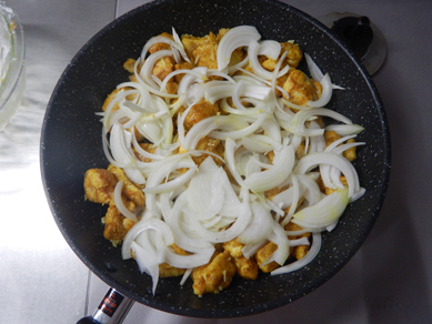 4.玉ねぎを入れて玉ねぎがしんなりとするまで炒め、水を加えて煮る。